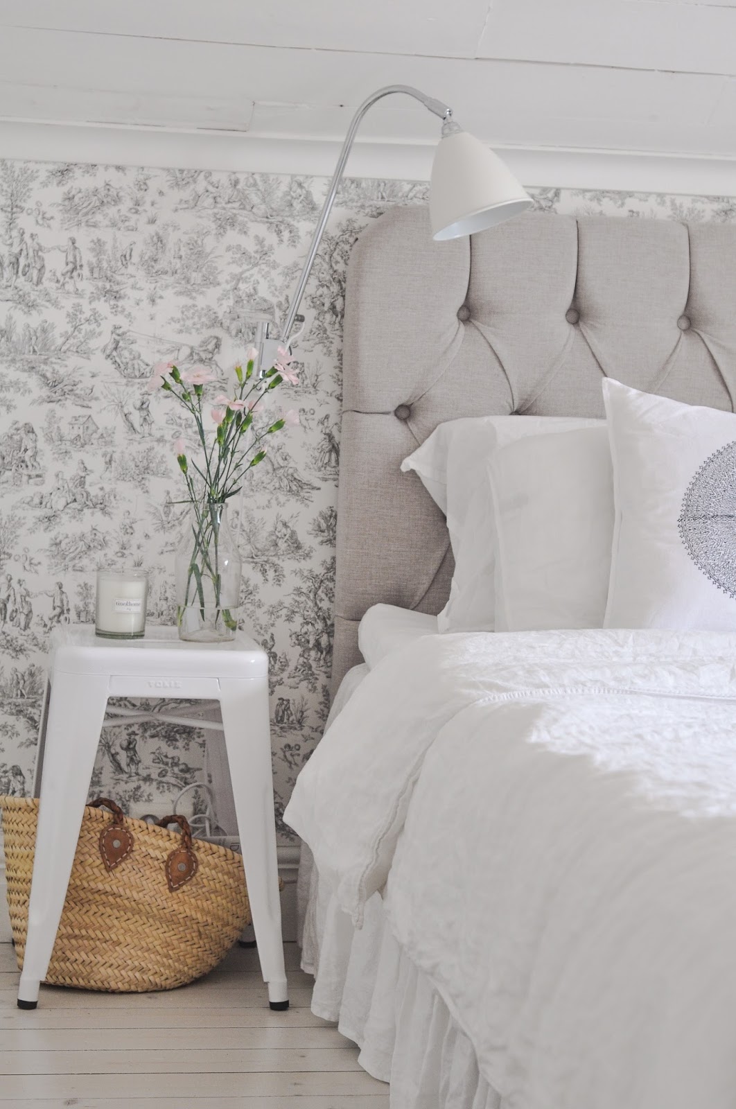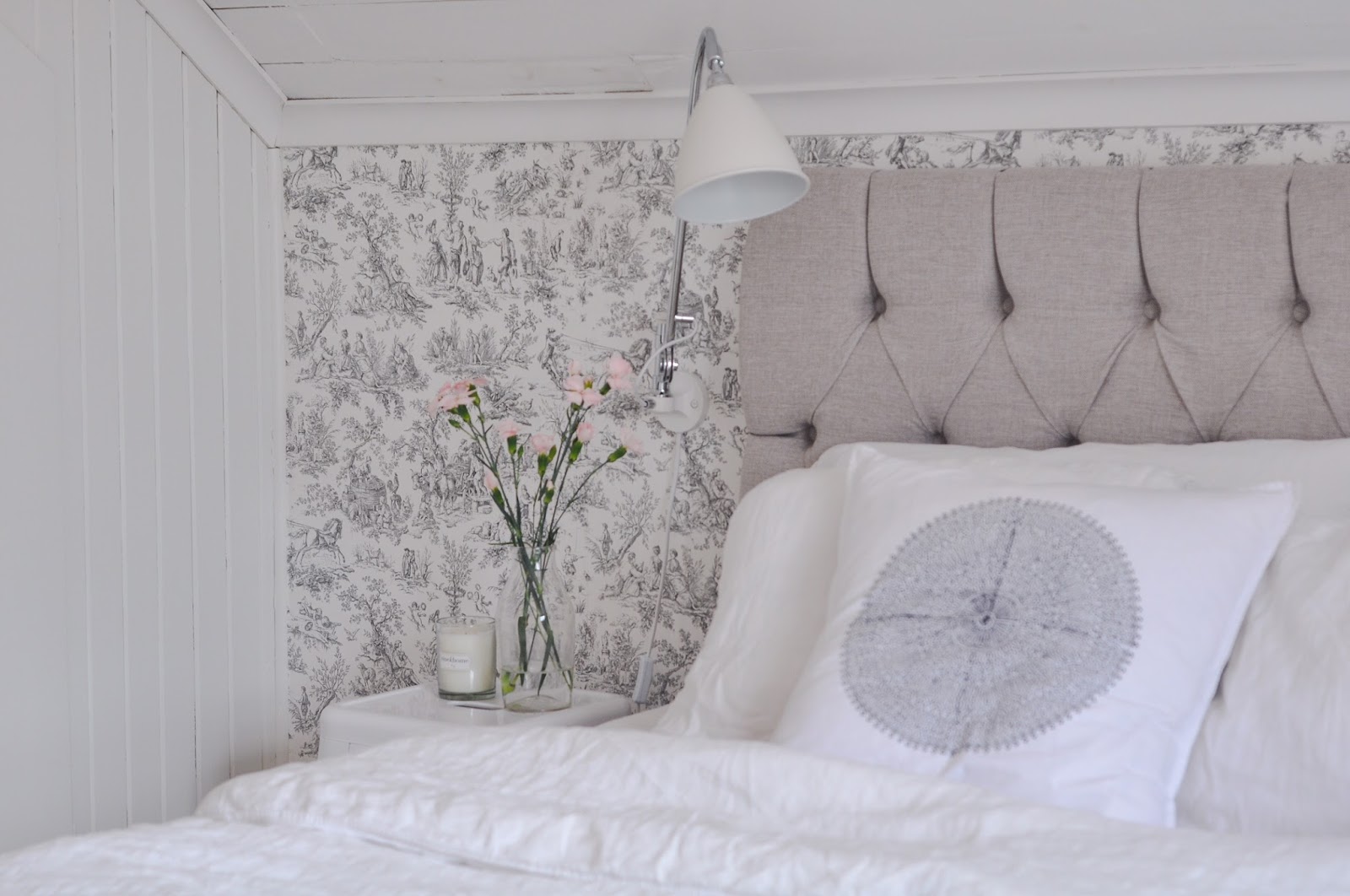 Något som jag älskar och får positiv energi av är inredning. Tror inte att det kom som någon direkt överraskning för er. Följer ni mig på Instagram (mariasvitabo) har ni förmodligen sett dessa bilder tidigare. Sedan jag bloggade sist har sovrummet fått sig en makeover. Jag har aldrig varit riktigt nöjd över känslan i rummet. Såg en dag en tapet som jag blev totalt förälskad i. Efter mycket detektivarbete hittade jag den här när jag sökte på ”tapet toile”.