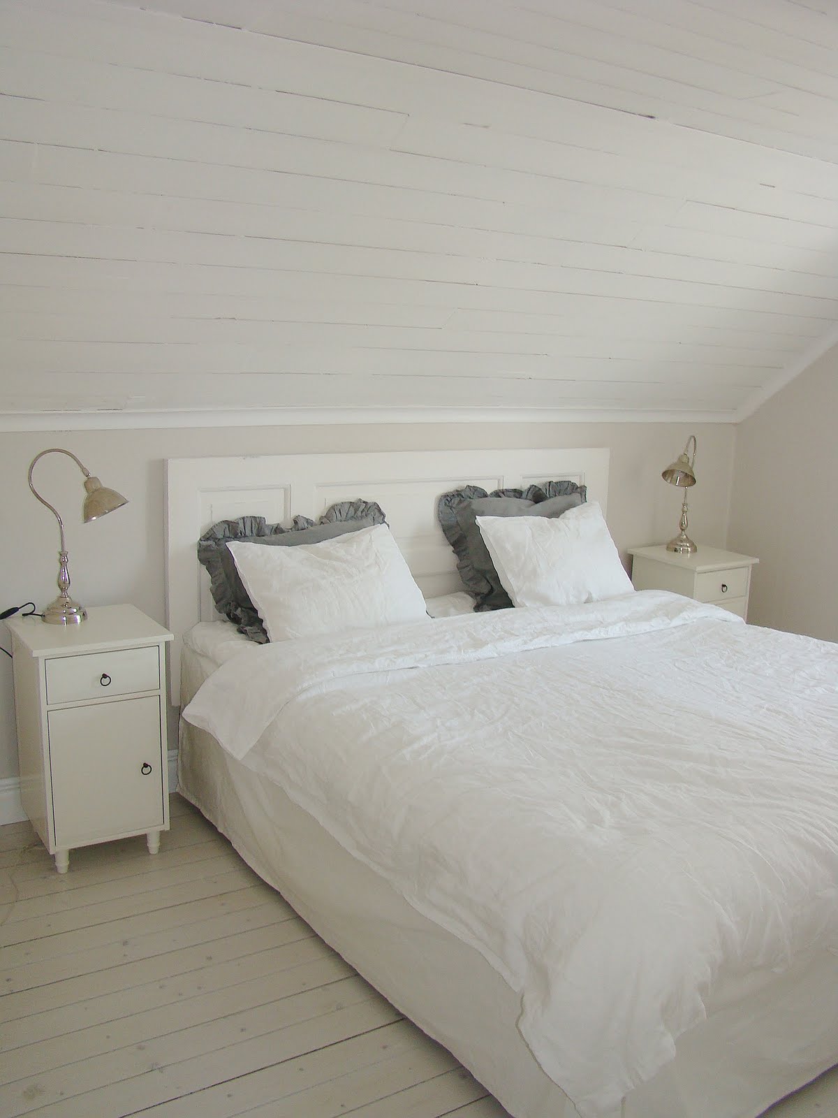 Har även piffat upp sängen med nya sängkläder. Påslakan och örngott i linne kommer från H&M home. De grå örngotten i  linne -lookalike kommer från Hemtex.