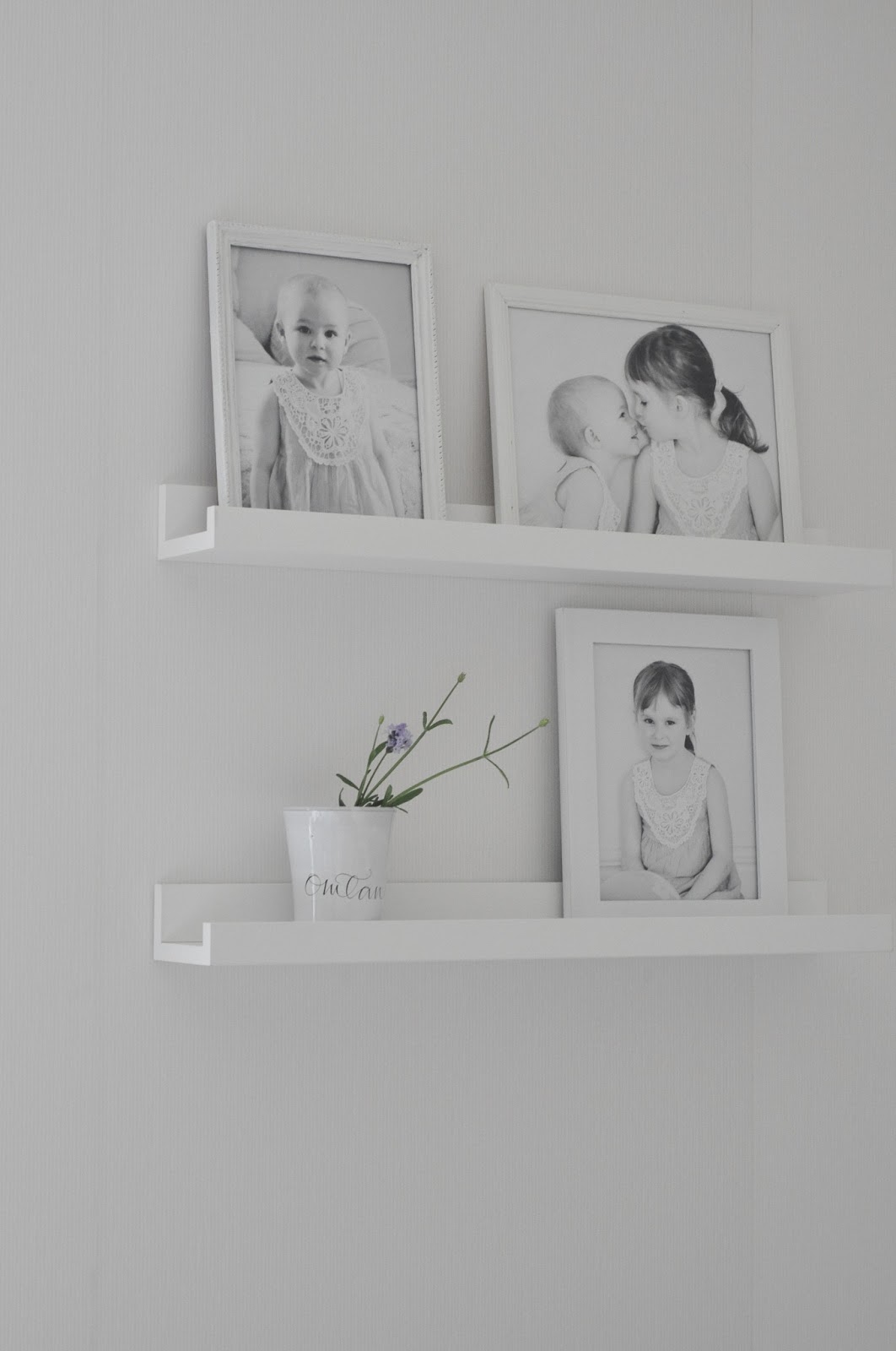 Nu har bilderna flyttat sig från nypor till ramar på enkla vita tavelhyllor! Nu känns det lite bättre!