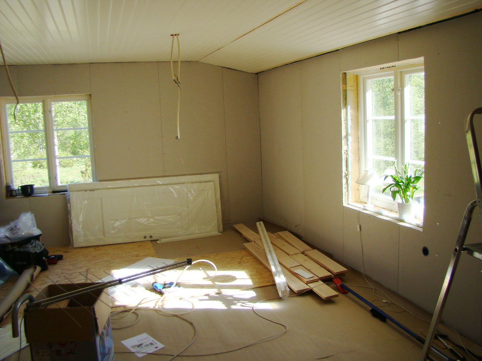 Nu har innertaket kommit på plats i det kommande vardagsrummet! Känns som ett helt annat rum! Nu ska vi försöka göra ett rum klart i taget. Det som skall göras i vardagsrummet är nu att sätta upp en vägg med råplan, spackla övriga väggar för tapet, fixa fönstersalningar och en hel del lister. Nu är det lite roligare projekt att göra, sådana som syns!