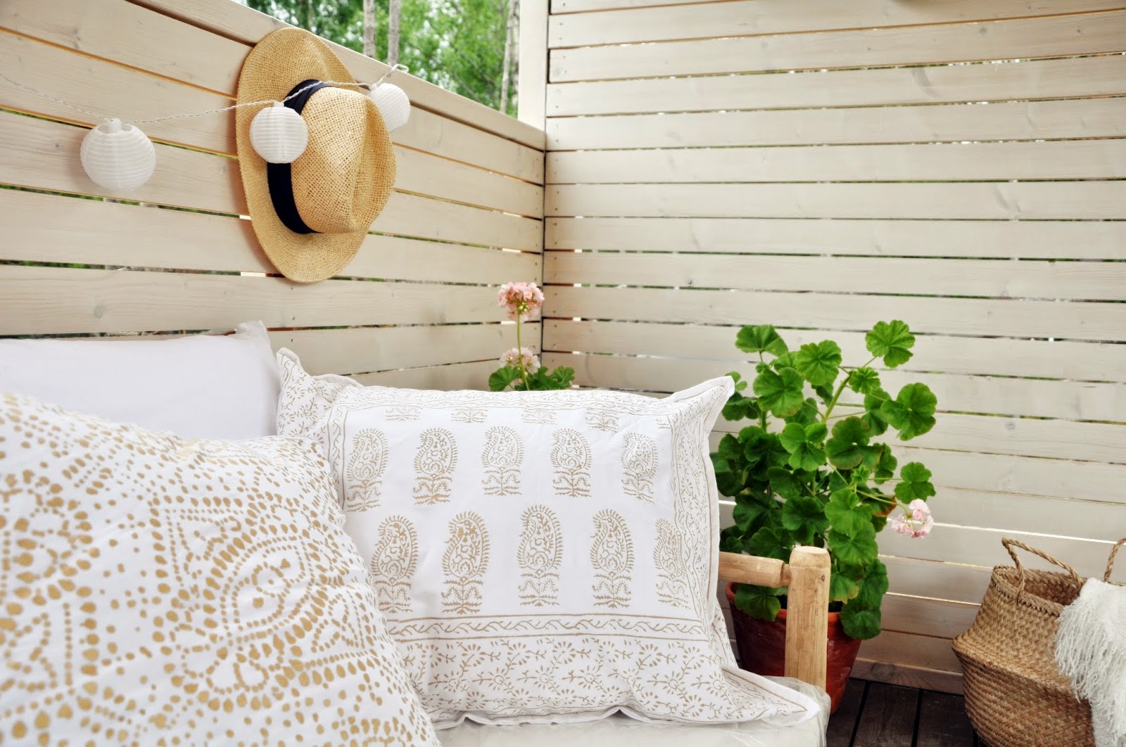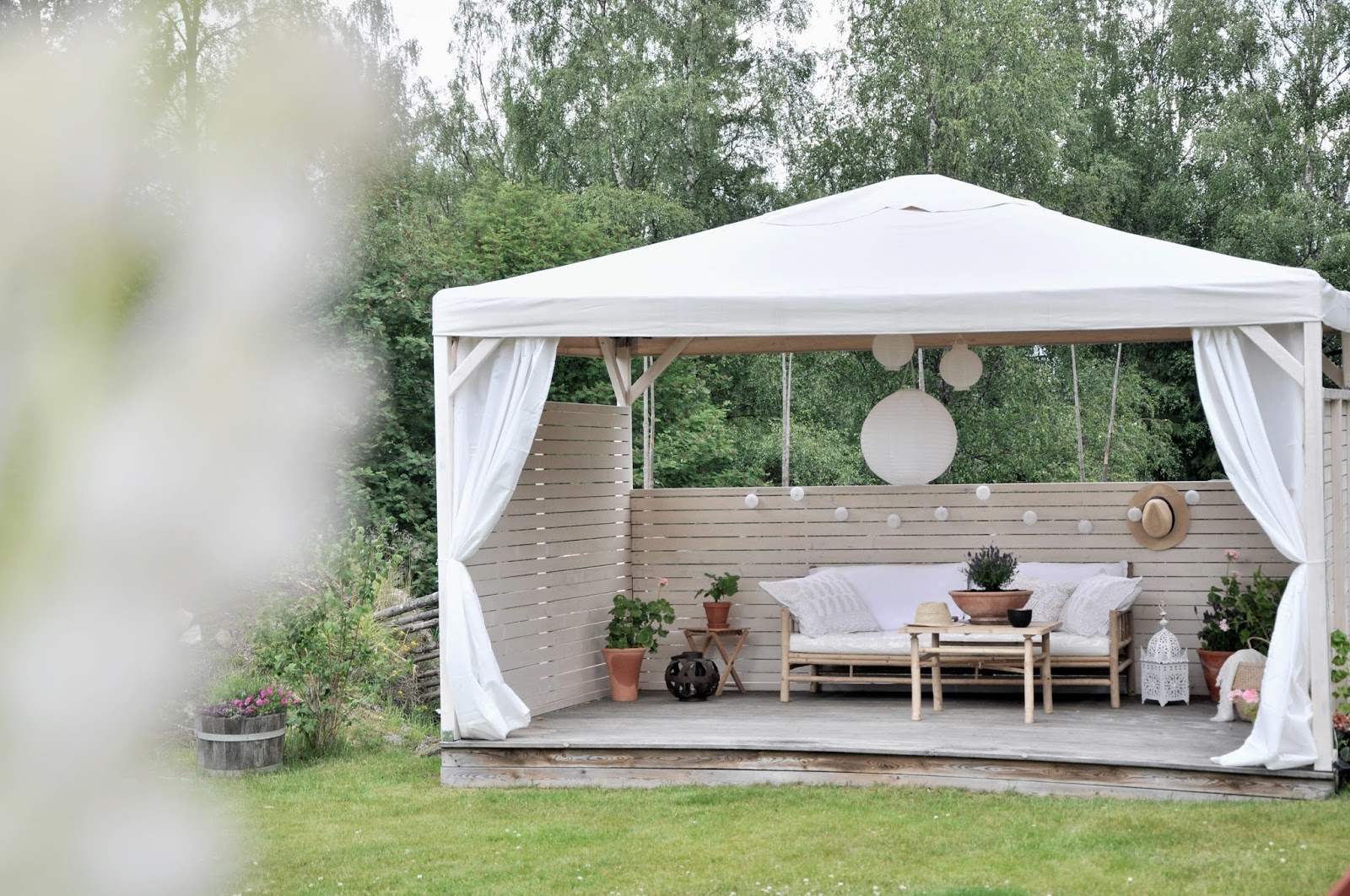 Innan hade uterummet bruna ”vindväggar”. Jag hade tröttnat på den bruna färgen och ville ha mer känsla av fräschhet. Eftersom vi utökat gräsmattan fick de gamla möblerna flytta ner till vår syrenhäck (just nu pytteliten häck, men om några år ska den förhoppningsvis ha växt till sig). Vi tog ner och sålde de gamla väggarna, slipade delar av stommen och min man byggde nya vindskydd. Dessa har sedan behandlats med flera lager av lasyr.