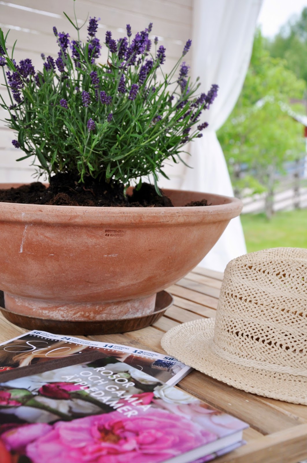 Min tanke var att ha blommor i gamla zinkkrukor. Köpte ett stort lerfat att ha på bordet och såg då att detta passade mycket bättre. Nu är det istället piffat med fina lerkrukor. I dessa har mina mårbackapelargoner och lite lavendel flyttat in. Bara älskar patinerade lerkrukor…